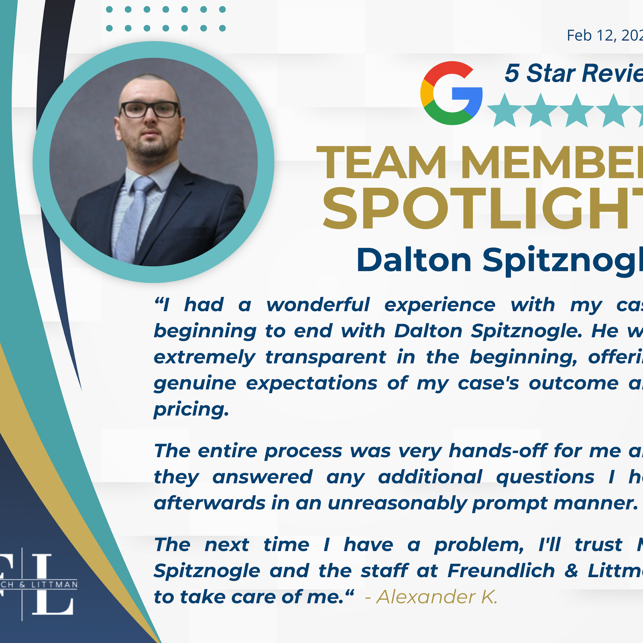 I have a wonderful experience with my case, beginning to end with Dalton Spitznogle. He was extremely transparent in the beginning, offering genuine expectations of my case's outcome and pricing. The entire process was very hands-off for me and they answered any additional questions I had afterwards in an unreasonably prompt manner. The next time I have a problem, I'll trust Mr. Spitznogle and the staff at Freundlich & Littman to take care of me.