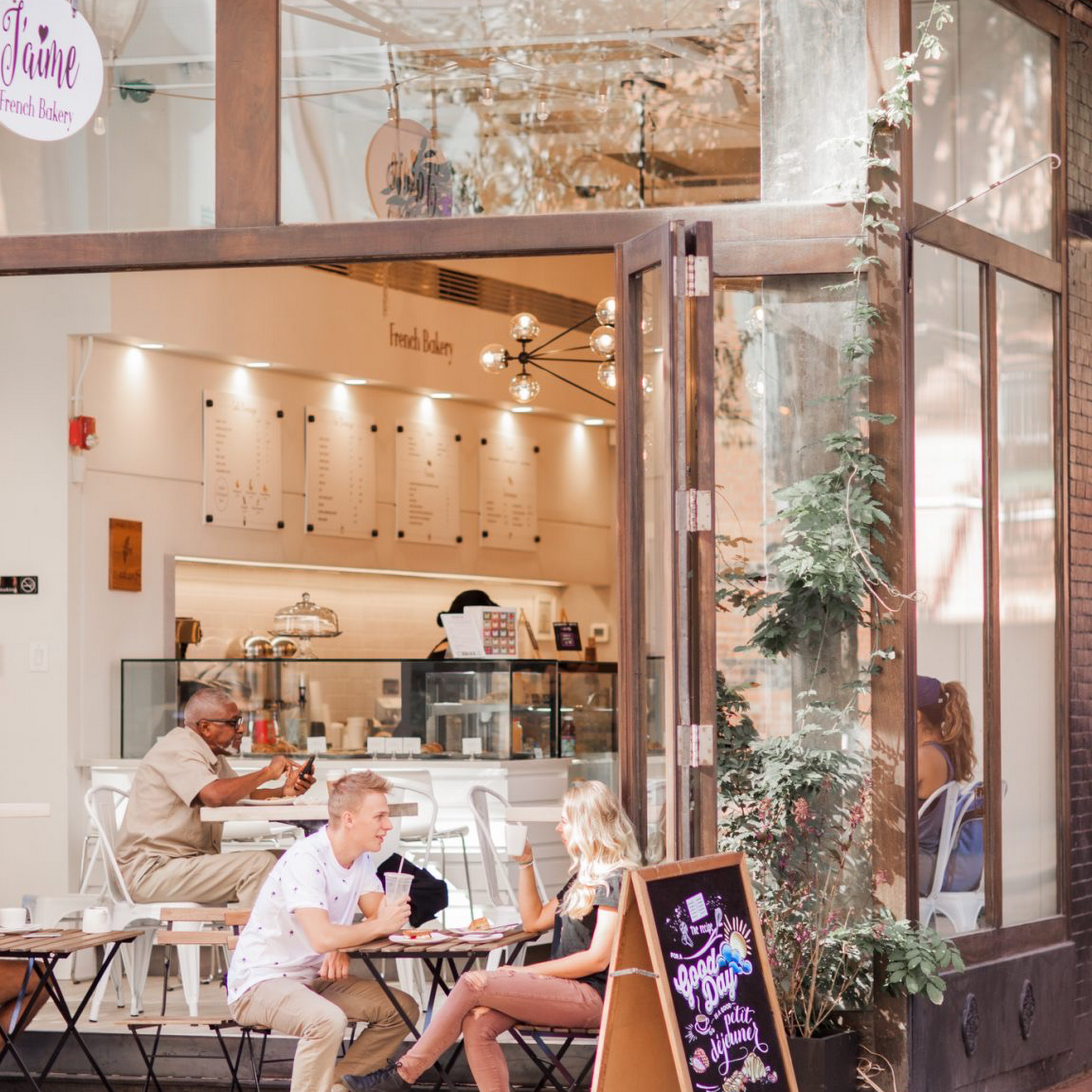 J'aime and its staff welcome you in a very bright café environment where you will find a wide variety of traditional french pastries, such as croissants, madeleines, eclairs, crêpes. You will also find coffee from La Colombe, tea and some lunch options (quiches, sandwiches, ect.)