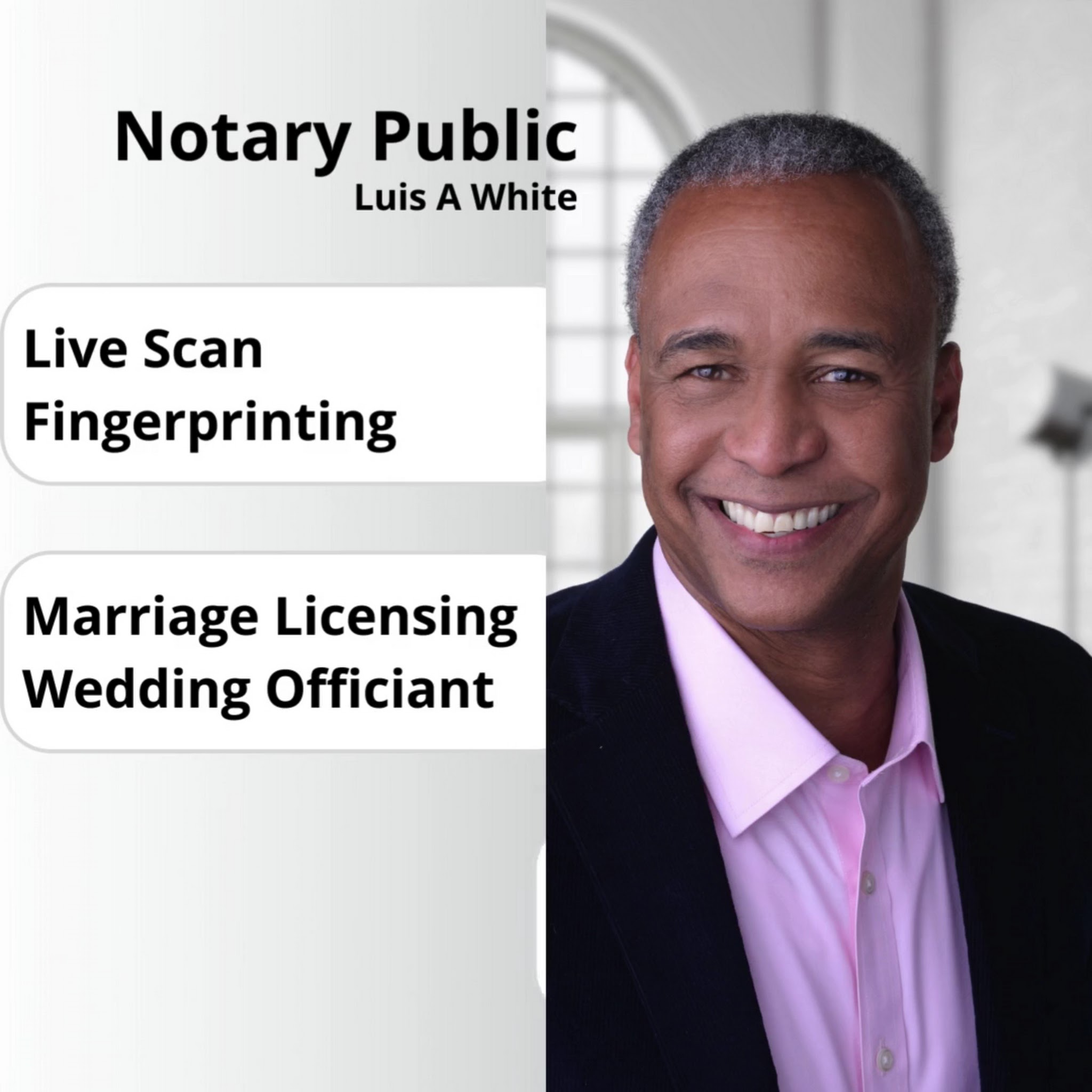 We at Luis A White Notary Services, LLC are committed to provide you with excellent, personalized service. As a Mobile Notary Service, Live Scan Fingerprinting, Marriage License, and Wedding Officiant, we come to you! Whether you’re home, work, place of business, a hospital, senior center; wherever you need us, we'll be there for you. We now offer on site appointments...