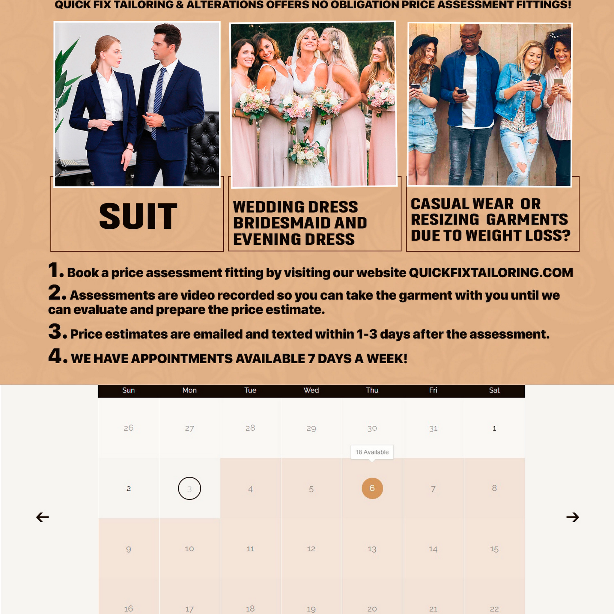 I received a ridiculously gigantic bridesmaid dress for an upcoming wedding, and didn’t have high hopes that it would ever look good on me. The folks at QuickFix Tailors were super friendly, super fast, and did a great job taking in the sides and length of my dress for a proper fit. I was especially impressed with their high tech video fitting and text reminders. The prices were very reasonable, in my opinion...$125 for everything. I’ll be back here for sure if I ever need clothing adjustments again!