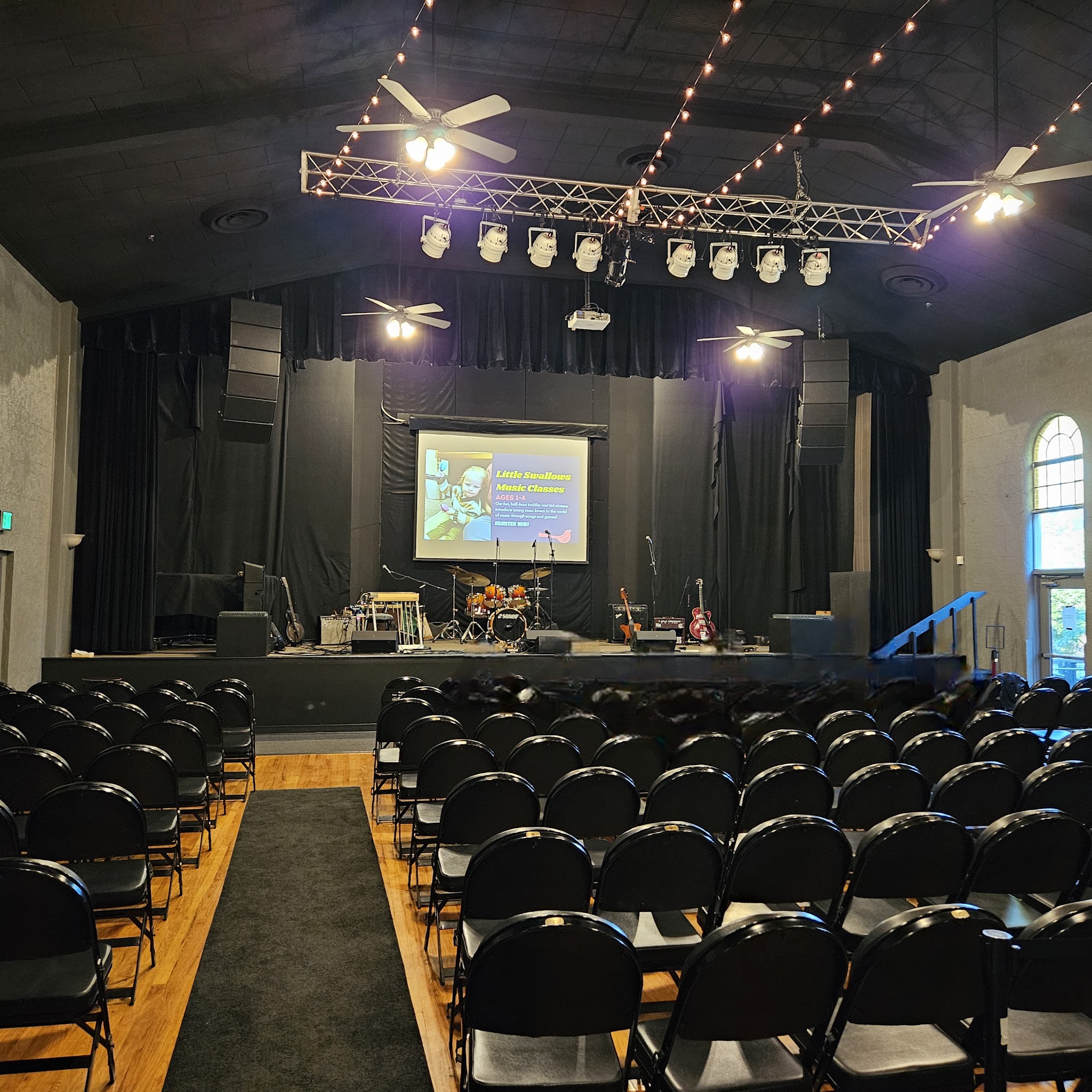 Swallow Hill Music - Daniels Hall is a very enjoyable venue! Full Stop. Photos are prior to show to visualize the space. Didn't get a seat count... call it plus or minus 200(?) Some might call it "intimate." I thought it was great. Great sound, more than comfortable seats, no bad views of the stage in the room.Swallow Hill Music supports music, including local music, so I will support Swallow Hill Music as often as I can! 🎶💜🎶
