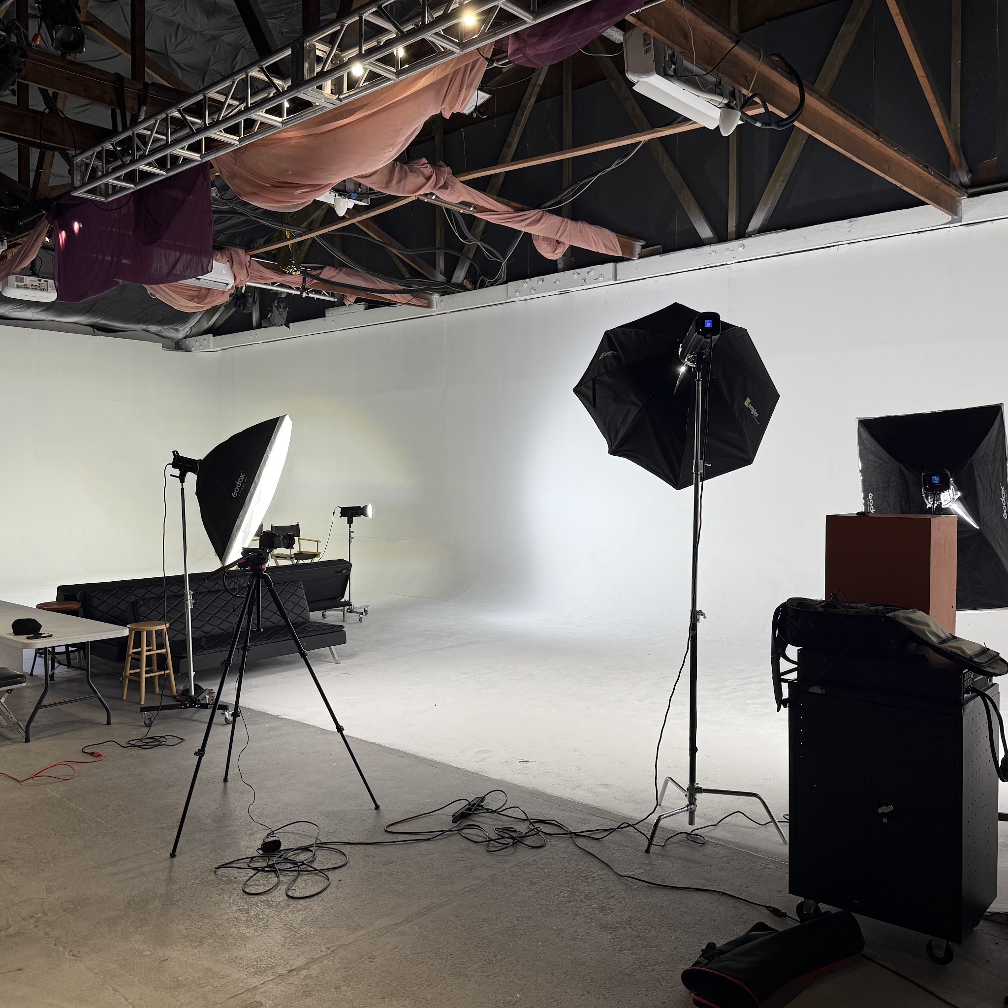Photo/ Video/ media production/ studio rental. Studio A with 3600 SQF with cyc wall. Studio B with 750 SQF with cyc wall. Black studio 500 SQF. 8000 SQF total for the whole space. Furniture/ props/ equipment. Studio rental and events. By appointment only.
