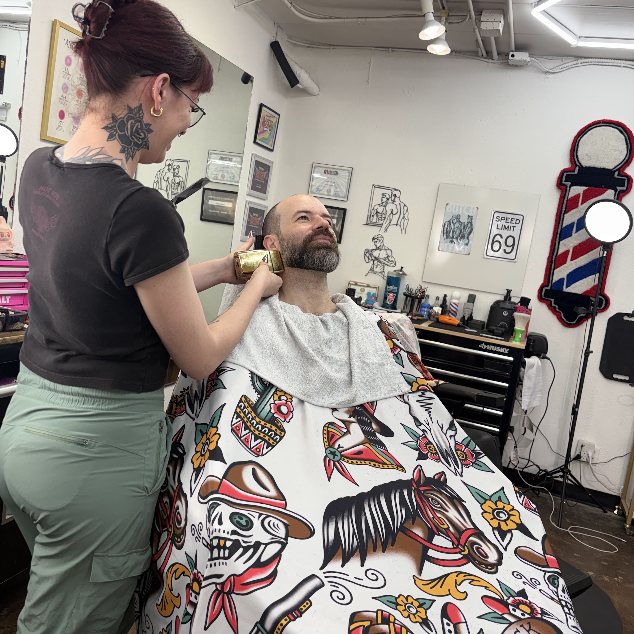 Smokin’ Mirrors is a LGBTQ friendly barbershop in the heart of Montrose. Here we offer high quality haircuts with not just fades, but experienced scissor work as well. Services like Beard trims with maintenance, along side hot towel straight razor shaves. We are known for being a queer friendly environment that serves everyone in Houston. With every service comes along a free beverage of choice. Flexibility is key, no appointments? Reach out!