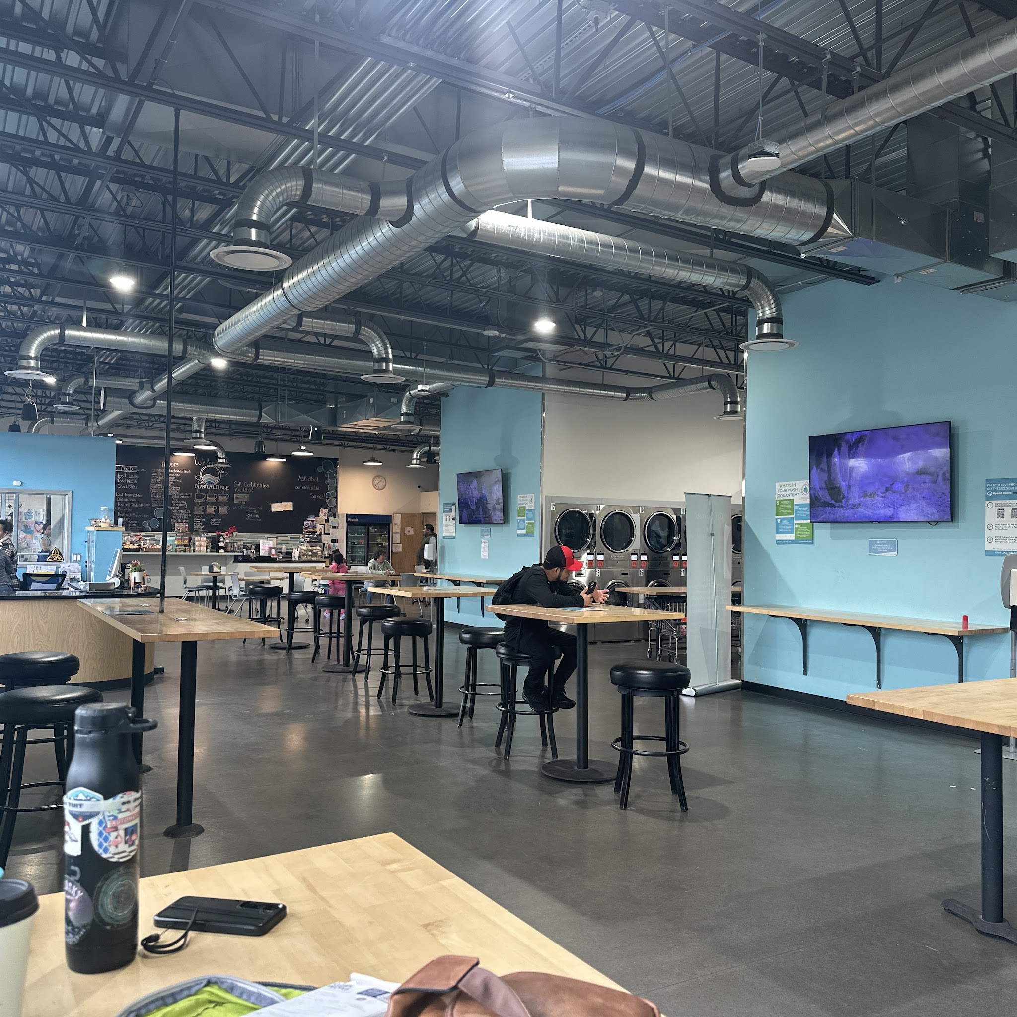 Wow! A great concept, a "laundry lounge". Full service coffee, drinks, and snack food while you spend time washing your clothes.Tina, an employee at Quantum, was a working machine.... Wow! A great concept, a "laundry lounge". Full service coffee, drinks, and snack food while you spend time washing your clothes.Tina, an employee at Quantum, was a working machine. She was never still, sweeping & mopping floors, polishing the stainless steel Speed Queen washers and dryers. Cleaning the glass doors. Hope the owner knows what a hard worker she is. It was by far the cleanest laundromat I have ever been to. You could pay by using a kiosk or downloading an app. Washer $6/30 minutes and dryer $2.50/25 minutes. All my clothes were dried by the end of the cycle, but my friend who had washed jeans needed a little more time. Clean bathrooms, a water bottle filling station, coffee and snacks, what more could you ask for? I was done with 2 loads in a little over an hour. Highly recommend! Read More