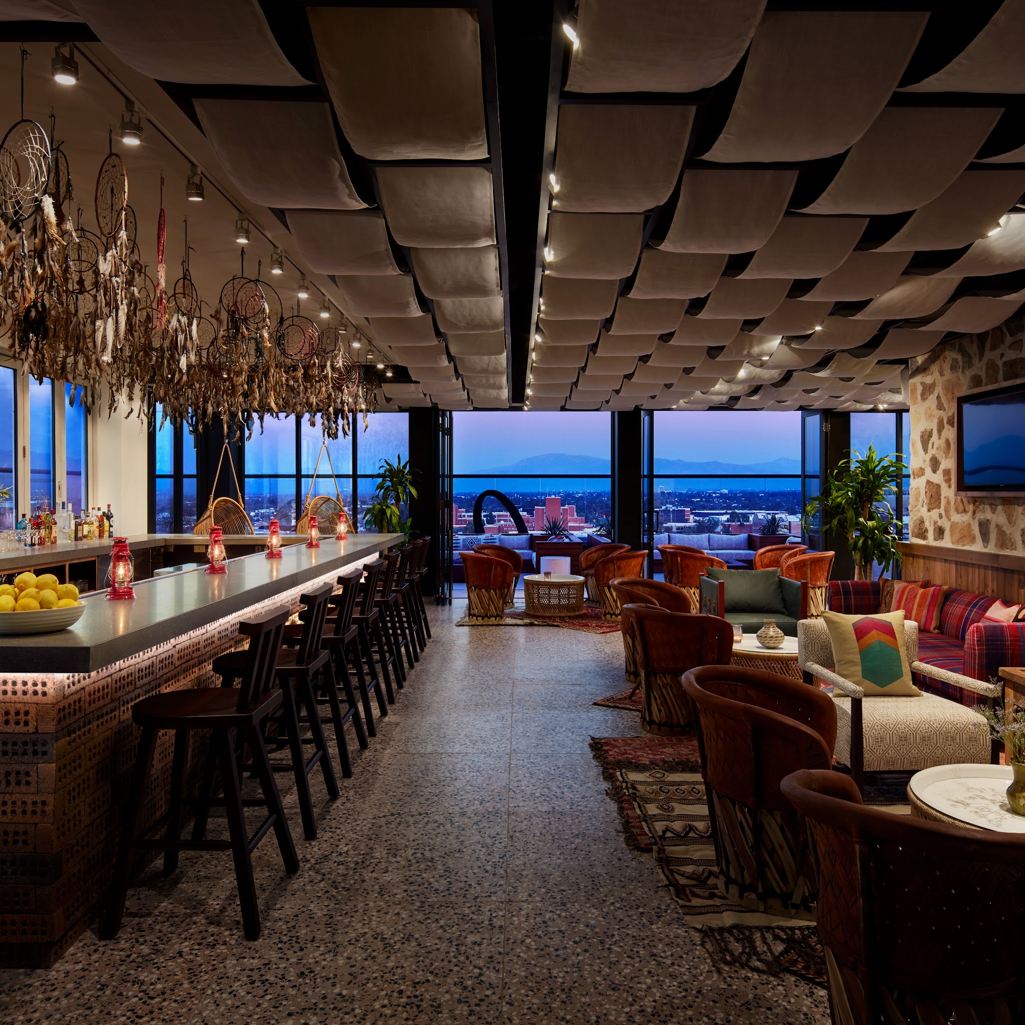 Perched on the 14th floor of the hotel, Moonstone offers breathtaking views of the city of Tucson, Mount Lemmon and beyond. Statement design details such as an expansive installation featuring 180 dream catchers crowning the bar area, panoramic views of University of Arizona, fire pits on the bar deck and a rooftop pool making for a year-round, indoor-outdoor retreat. The restaurant and bar offers classic American cuisine with a playful, regional twist. Menu highlights include Tajin Spiced Shrimp and Mango Skewers, Pimento Cheese and Crackers and the Southwestern Avocado Chicken Panini. The beverage program offers localized flare with large format drinks and festive shots perfect for intimate gatherings and celebratory occasions.